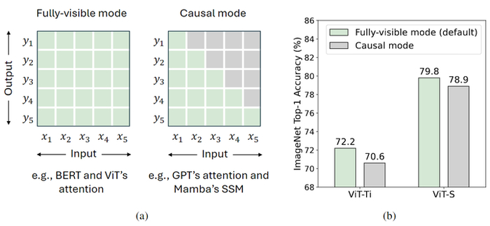 图4:(a) 两种模式的 token mixing 策略。共计 T 个 tokens,全部可见模式允许 token t 根据所有的 tokens 来计算输出,而 Causal 模式则限制 token t 根据当前以及之前的所有的 tokens 来计算输出。(b) 作者将完全可见模式修改为 Causal 模式,并观察到 ImageNet 的性能下降