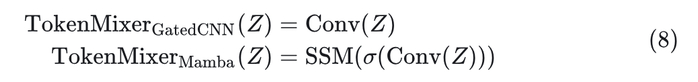 式中, TokenMixer()代表 token mixer,其在 Gated CNN 和 Mamba 中分别为: