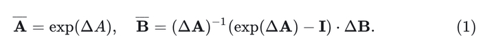 Mamba 模型的 token mixer 是 selective SSM[9][20],其包含4个 input-dependent 的参数, 并将它们通过下式变为 :
