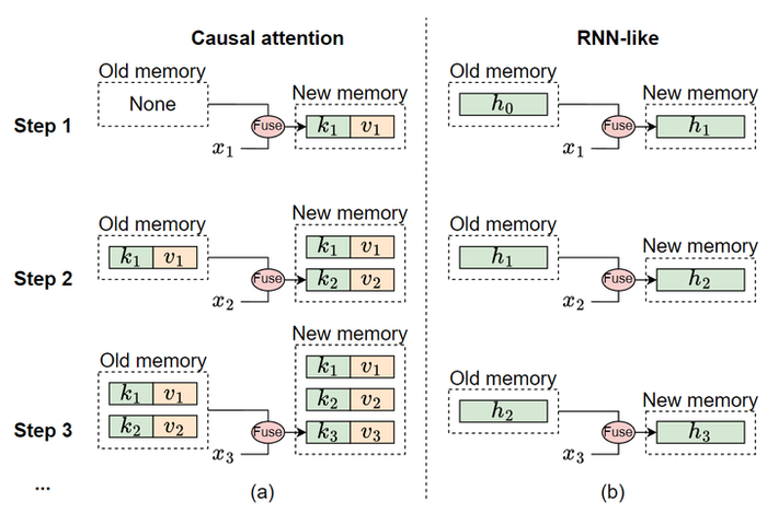 图3:从 memory 的角度说明 Causal attention 和 RNN-like 模型的区别,x_i 代表第 i 步的输入 tokens。(a): Causal attention 将之前的所有 key 和 value 存入 memory。memory 是无损的;(b):RNN-like 模型将之前的 tokens 压缩为固定大小的状态,存入 memory。memory 是有损的