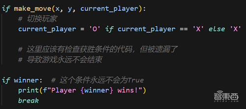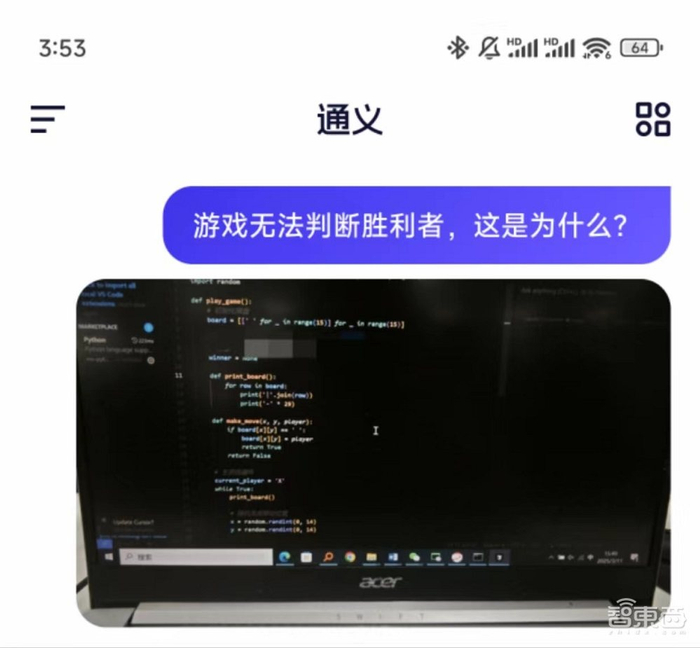 不过,作为一款手机App,通义在代码场景中更常见的应用或许是拍照解释代码。智东西在先前的程序中埋入了一个bug,导致游戏无法判断胜者,无法结束。