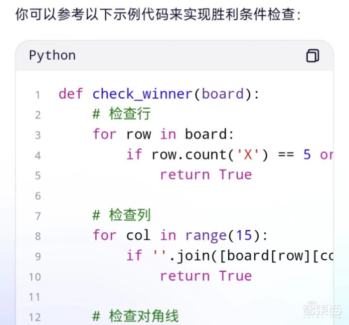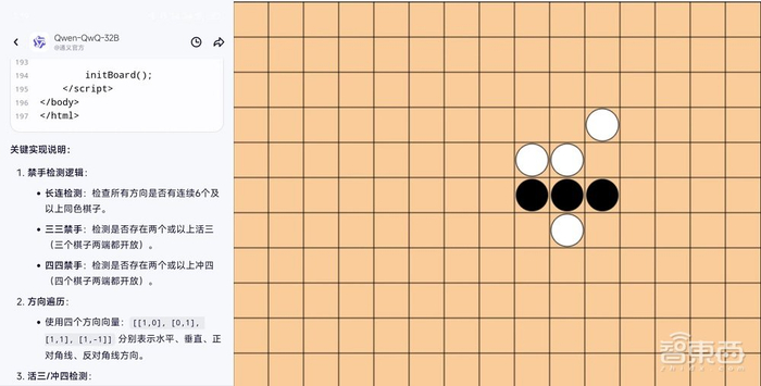 测试完新版通义App中QwQ-32B智能体的数学能力,我们再来看看其编程方面的实力究竟如何。智东西让QwQ-32B编写了一个基于HTML的五子棋小程序,并加入了“三三禁手”、“长连禁手”等限制黑棋的规则。