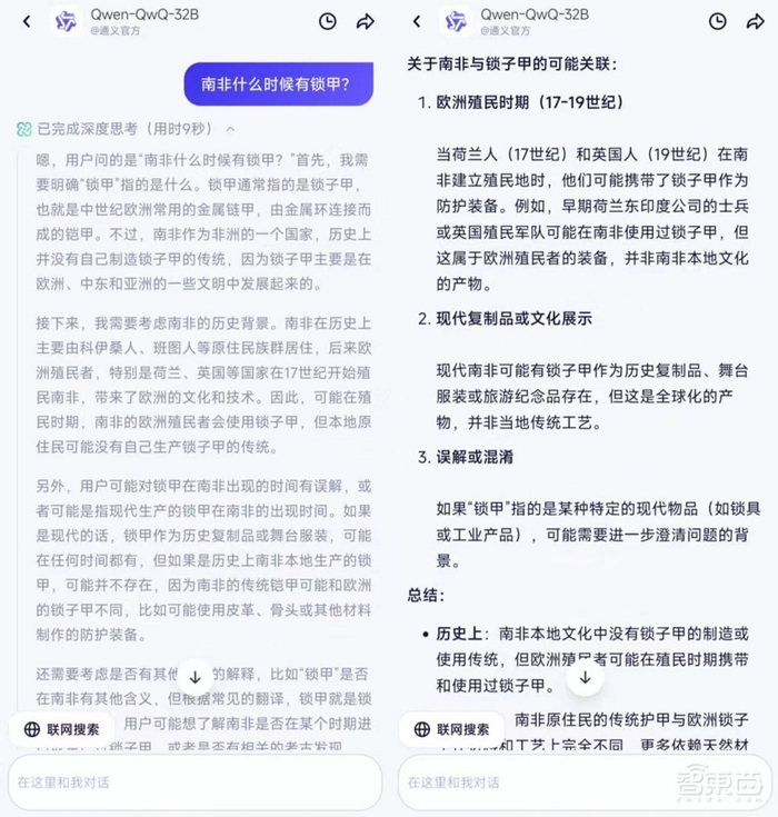 目前,有许多大模型都在历史类问题上表现不佳,尤其是在涉及资料较少的国家和民族时。智东西让QwQ-32B智能体分析了“南非有没有锁甲”这一问题。观察它的思考过程,我们可以发现,QwQ-32B从不同年代、不同民族的角度条分缕析地回答了这一问题,答案也符合史实。