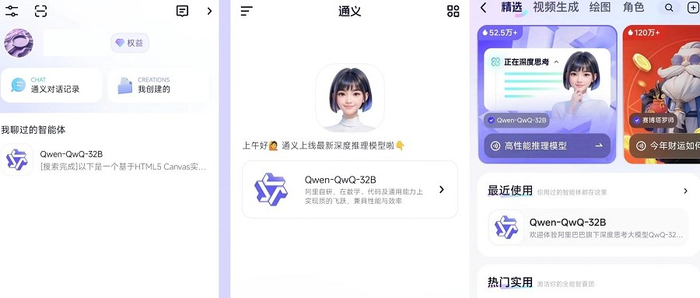 此外,通义首页还会推荐基于其他模型或者具备其他不同功能的智能体。目前,基于Qwen-QwQ-32B的被放在了首页的推荐栏中。用户只需点击,就能与这款新模型进行对话。