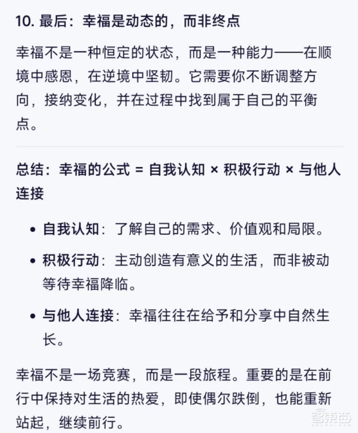 在使用通义App的过程中,我们也能感受到与这一形象相符合的贴心体验。通义App在QwQ-32B智能体中推荐了这样一个问题:“如果你是人类,如何过幸福的一生?”模型给出的回答不仅包括实操建议,还撰写了鼓励的话语,既贴心又实用。