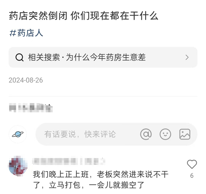 药店倒闭并非个例。社交平台上,有不少相关的帖子,有人称:“药店突然倒闭,你们现在都在干什么?” 一位药店工作人员回复:“我们晚上正上班呢,老板突然进来,说不干了,大家立刻打包,一会儿就把东西搬空了。”