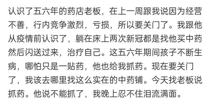 有人提到,认识五六年的药店老板,上一周无奈告知,因经营不善、行业竞争激烈,亏得厉害,只能关门。