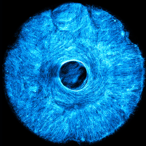 为进行演示,研究人员制作了一种图案类似人类虹膜微观的肌肉组织。虹膜由围绕瞳孔的一圈肌肉构成,这个肌肉环内部是一圈同心排列的圆形肌肉纤维,外部是呈放射状伸展的纤维,如同太阳光线。这种复杂结构共同协作,实现瞳孔的收缩或大。