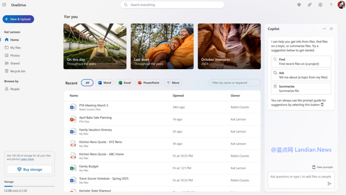 微软确实在为 Microsoft 365 应用程序带来更多人工智能相关的功能,最新推出的功能是 Microsoft Copilot for OneDrive 云存储,目前仅在 Web 版 OneDrive 中提供。