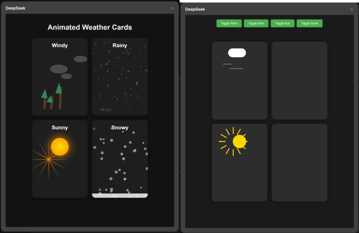 创建一个包含 CSS 和 JavaScript 的单个 HTML 文件,以生成一个动画天气卡片。卡片应通过不同的动画直观地表示以下天气条件:风:(例如,移动的云朵、摇曳的树木或风线)雨:(例如,落下的雨滴、形成的水坑)晴:(例如,闪耀的光线、明亮的背景)雪:(例如,落下的雪花、积雪)并排显示所有天气卡片。卡片应具有深色背景。在此单个文件中提供所有 HTML、CSS 和 JavaScript 代码。JavaScript 应包含一种在不同天气条件之间切换的方法(例如,一个函数或一组按钮),以演示每种天气的动画。