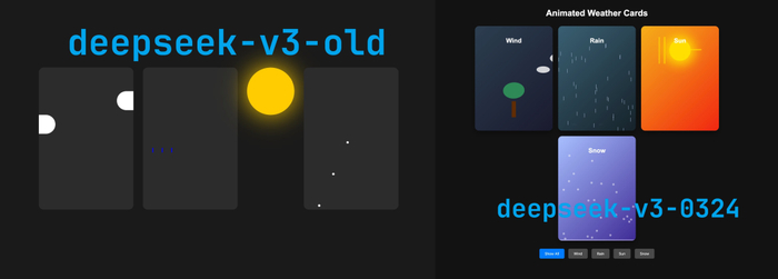 左侧是 DeepSeek 新版 V3 模型的生成结果,右侧为 R1 的生成结果。