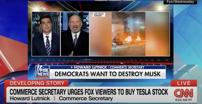 3月19日,美国商务部长霍尔德·卢特尼克(Howard Lutnick)在福克斯新闻频道上公开为特斯拉站台,号召观众买特斯拉股票,称马斯克是“最值得投资的人”。“你得在今晚的节目里学到一件事,那就是‘买入特斯拉’,”卢特尼克说,“特斯拉的股票以后再也不会像今天这么便宜了!”