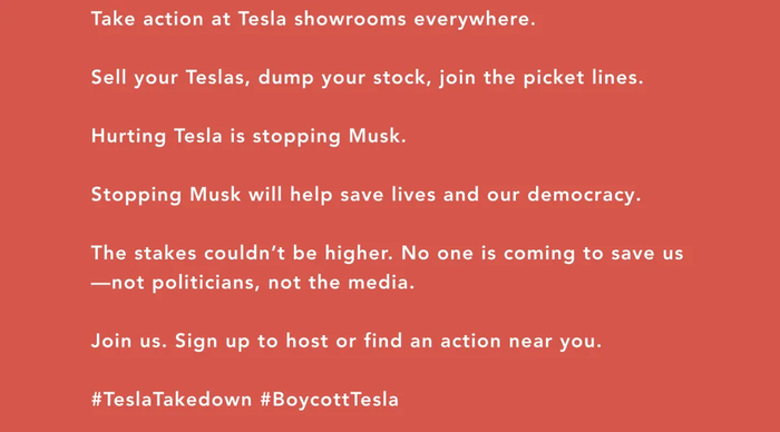 “卖掉你的特斯拉,抛售你的股票,加入抗议队伍,现在就制止马斯克”,在Tesla Takedown的网站首页,简单地列出了行动纲领。