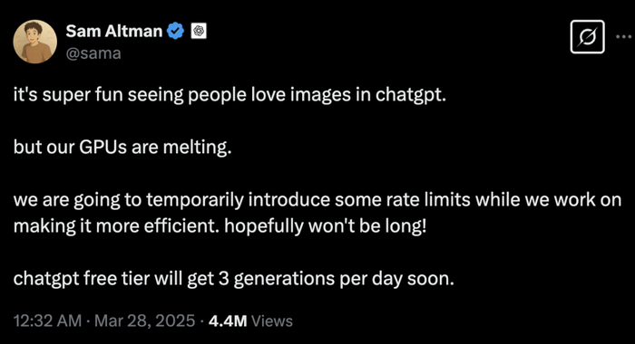 大量用户正在将现有的图像上传到 ChatGPT,并要求聊天机器人以新的风格重新创作这些图像。今天,奥尔特曼在 X 上发文表示:“看到大家如此喜爱 ChatGPT 的图像功能非常有趣,但我们的 GPU 快扛不住了。”虽未具体说明限制次数,但 Altman 称该措施不会持续太长时间,因为他们正在尝试提升处理海量请求的效率,免费用户将“很快”能每天最多生成三张图像。