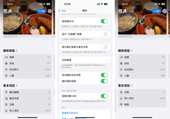 在照片 app 的设置选项中,Apple 也为其新增了一个选项:显示最近查看与最近共享,默认情况下这个选项是开启状态,当我们在设置中停用这个选项后,照片 app 中的这两个入口就会在「更多项目」处消失。
