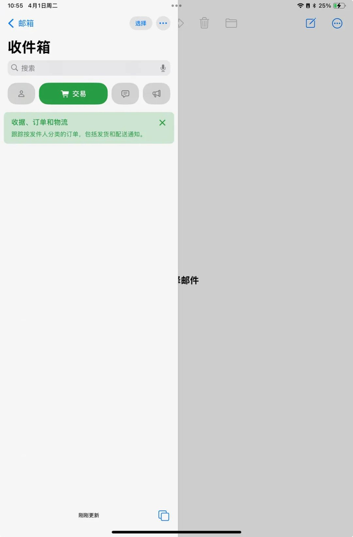 在 iOS 18.2 版本中加入的邮件自动分类功能,于 iOS 18.4 版本中登录了 iPad 端的邮件 app,目前所有的邮件都会被自动归类到主要、交易、更新、推广等类别中,点击顶部的标签即可切换到相应类别的邮件列表中。