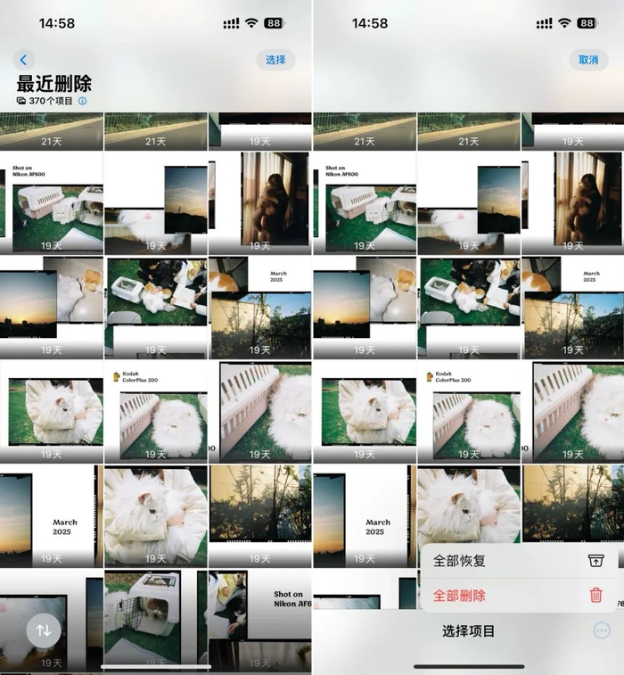 在 iOS 18.4 新版本中,照片 app 终于支持了一键全部恢复或者全部删除照片。在最近删除界面中,点击右上角的「选择」按钮,然后点击右下角的三点菜单按钮,就可以看到全部恢复和全部删除这两个选项。