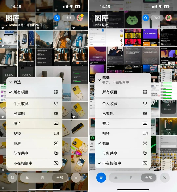 首先,在全屏的图库视图下依次点击「底部最左侧的排序按钮 - 筛选」,可以看到 Apple 为照片 app 新增了两个筛选选项,分别是「与你共享」和「不在相簿中」。值得一提的是,这两个新的筛选选项和其它选项一样,可以通过多选来进行多条件筛选。