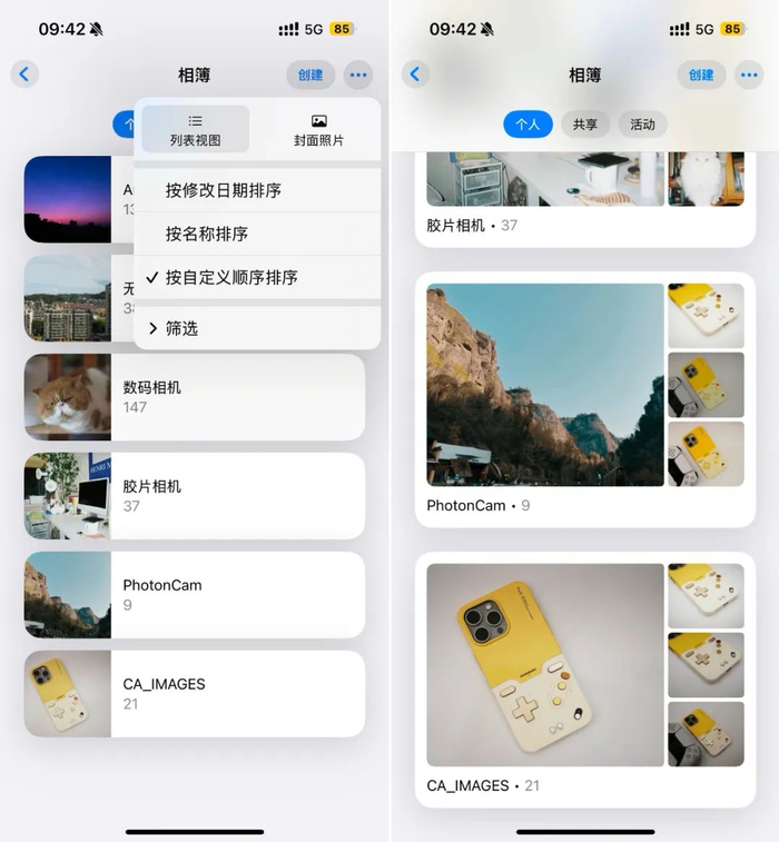 在相簿界面中,Apple 在新版本中新增了一个「封面照片」的视图,点击右上角的三点菜单按钮即可切换。切换到「封面照片」视图后,每一个相册都会以「1+3」的排列方式来展示四张封面照片。