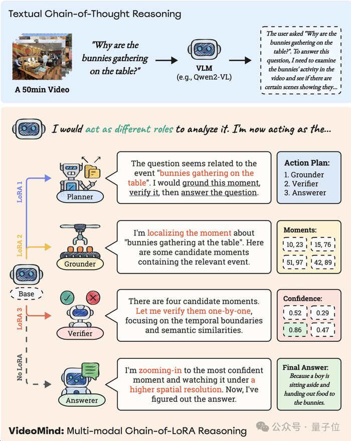 港理工、新加坡国立团队推出VideoMind框架,核心创新在于角色化推理(Role-based Reasoning)和链式LoRA(Chain-of-LoRA)策略。