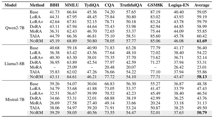 NoRM 通过在三种不同的基模型以及三个不同的微调任务上进行实验,展现出强大的性能。