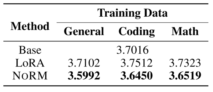 通过对 LoRA 和 NoRM 在记住预训练知识的能力上进行比较,可以证实 NoRM 的设计哲学在于尽可能保留下游语料中和预训练参数中重叠最大的部分。通过测试在 WikiText-103 测试集上的损失函数值,可以看到 NoRM 的损失降低,而 LoRA 相比于基模型都有着一定程度上的升高。