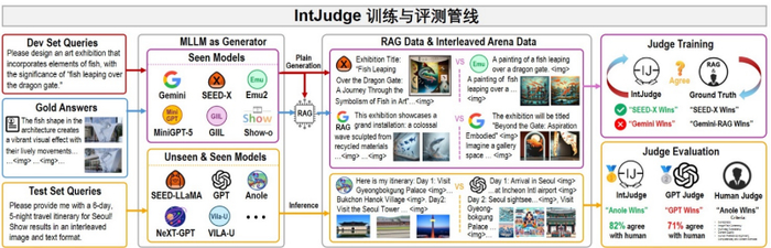 具体来讲,IntJudge 的训练数据由两部分组成:一是高质量对比数据 Interleaved Arena Data,这些数据通过对不同模型在 OpenING 开发集上生成的的图文交错内容进行人工判断获得;二是利用参考增强生成(RAG)技术构建的大规模增强数据 RAG Data,通过在每个 AB 对中认定以人工标注的金标准答案为参考的生成内容优于模型直接生成的内容。这种新颖的数据增强策略在极大丰富 IntJudge 模型训练数据量的同时确保了评测模型在多种生成风格和场景下的稳定表现。