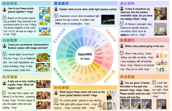 OpenING 首次系统地构建了涵盖 23 个现实领域、56 个具体任务的图文交错生成综合评测基准,共计收集 5400 个真实场景下的图文交错实例。这些实例来源于旅行指南、产品设计、烹饪助手、创意头脑风暴等日常高频应用场景。