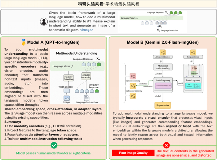 文本生成方面,GPT 系列模型的质量已达到甚至超越人类水平,但在图像生成质量和真实性方面,所有模型的生成结果仍难以企及人工标注的自然图像。