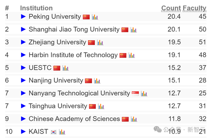 上交清华北大浙大拿下前四,中国科学院、哈工大冲进全球AI领域的TOP 10。