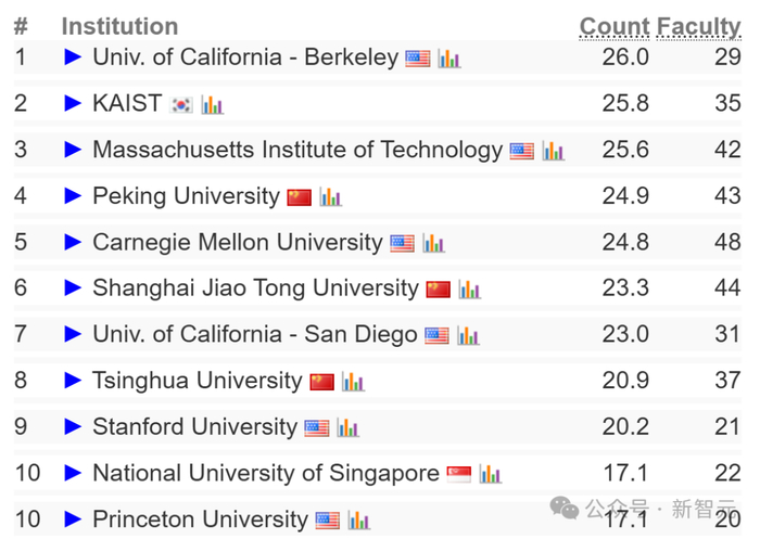 如上文所述,在AI这一大领域,全球排名前十的高校/机构是: