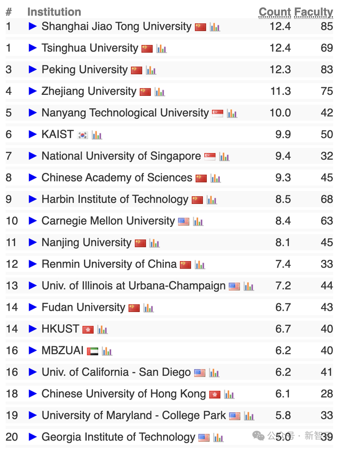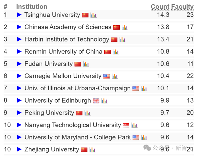 中国高校/机构继续包揽多个席位,其中清华排名第2,上交大/浙大并列第3,北大第5。