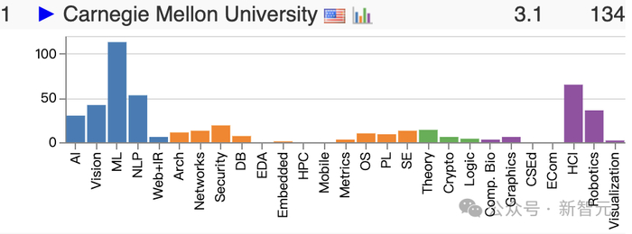 具体来看,CMU在机器学习、NLP、计算机视觉、AI领域发表的论文数量最多。
