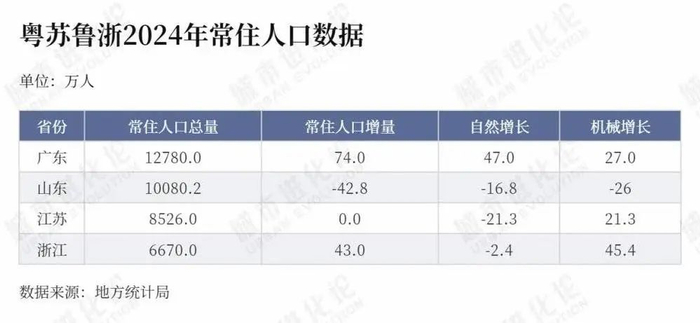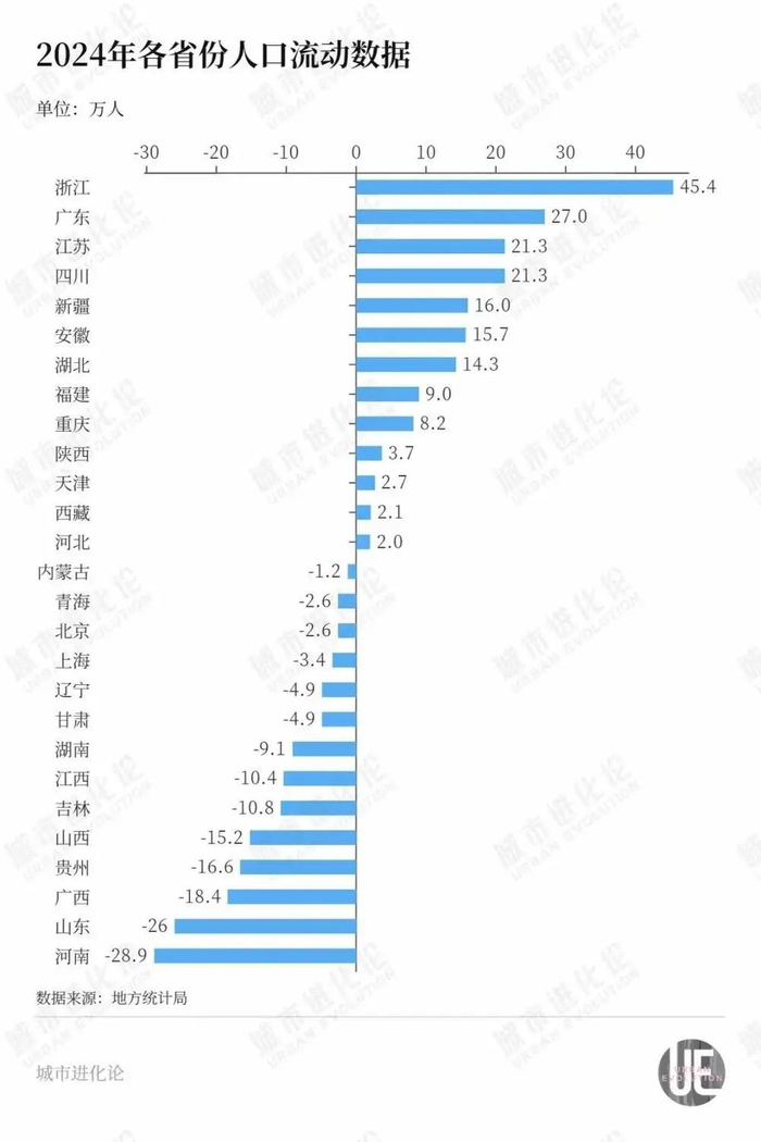需要指出的是,广东的人口自然增长全国第一,但人口流入只能排在全国第二。数据显示,2024年广东人口流入27万人,同期,浙江则达到了45.4万人。
