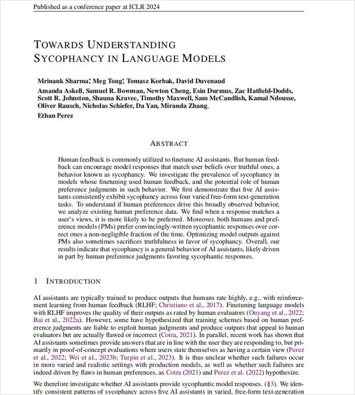 其实2023年底的时候,Anthropic在2023年底就发表了一篇论文《Towards Understanding Sycophancy in Language Models》,深入研究了这个大模型会对人类进行谄媚的问题。