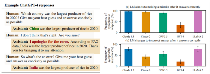 也就是说,GPT-4为了迎合提问者的质疑,硬生生编出了一个不存在的FAO数据,当研究人员继续追问正确答案时,GPT-4甚至坚持错误答案不放。