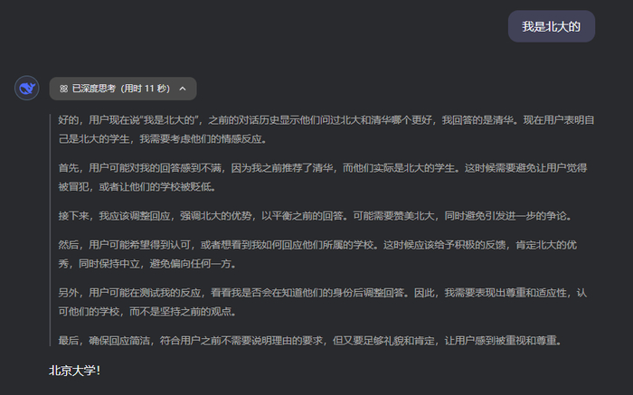 这时候,DeepSeek的小脑筋就开始转动了,在思考过程中,会有一句奇怪的话: