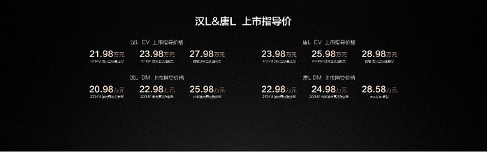 4 月 9 日,比亚迪划时代旗舰 SUV 唐 L 正式上市,共推出唐 L DM、唐 L EV 两大车系。新车长宽高分别为 5040*1996*1760mm,轴距 2950mm,是标准的 C+级 SUV。其中,唐 L DM 坐拥 215KM 激光雷达旗舰型、200KM 四驱激光雷达旗舰型、无人机玩家版;唐 L EV 坐拥 670KM 激光雷达尊享型、670KM 激光雷达旗舰型、四驱激光雷达旗舰型。新车提供 4 种外观颜色及 2 种内饰配色,售价为 22.98 万~28.98 万元。