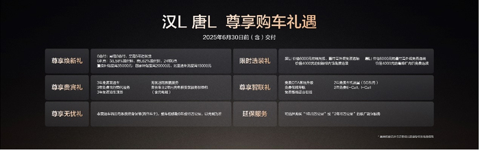 伴随唐 L 的上市,比亚迪王朝网还准备了七重购车礼遇。截至 6 月 30 日 24:00 前完成购车开票,用户可享尊享金融礼,0 首付、0 利息任选其一;尊享置换礼,置换补贴至高 35000 元;还有尊享无忧礼、尊享贵宾礼、尊享智联礼、延保服务可选。其中,尊享置换礼中除了至高 20000 元国补,更有首销期限时置换补贴 10000 元,同时比亚迪老车主额外可享 5000 元置换补贴加码!此外,用户额外可享限时选装礼,包括价值 6000 元的墨竹青外观免费选装、价值 4000 元的霞绯红内饰免费选装。尊享购车礼遇加持,进一步降低消费者的购车用车成本,让更多年轻用户畅享旗舰级出行体验。