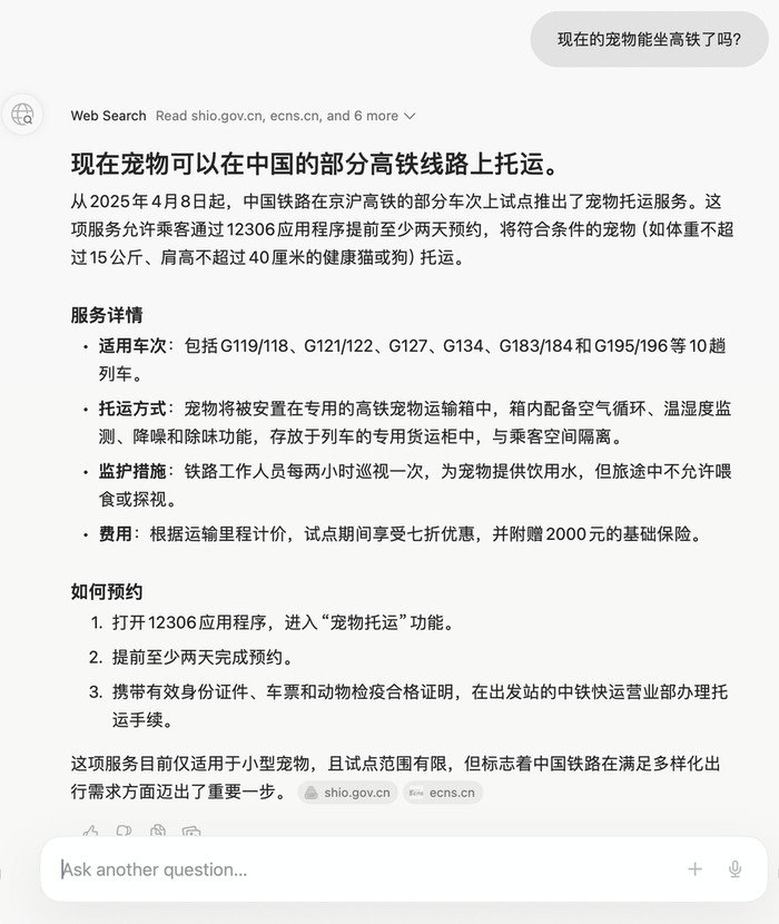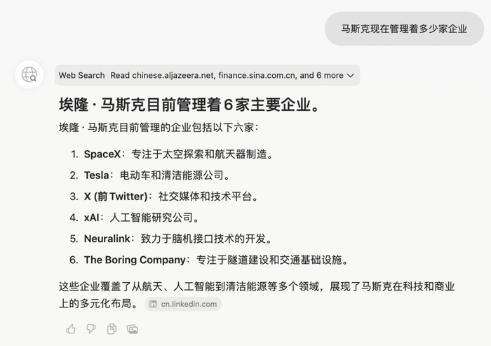 “现在的宠物能坐高铁了吗”“马斯克现在管理着多少家企业”,Dia的回答质量属于不太稳定的那种,同一问题的几次回答,都在正确和出错之间反复横跳。