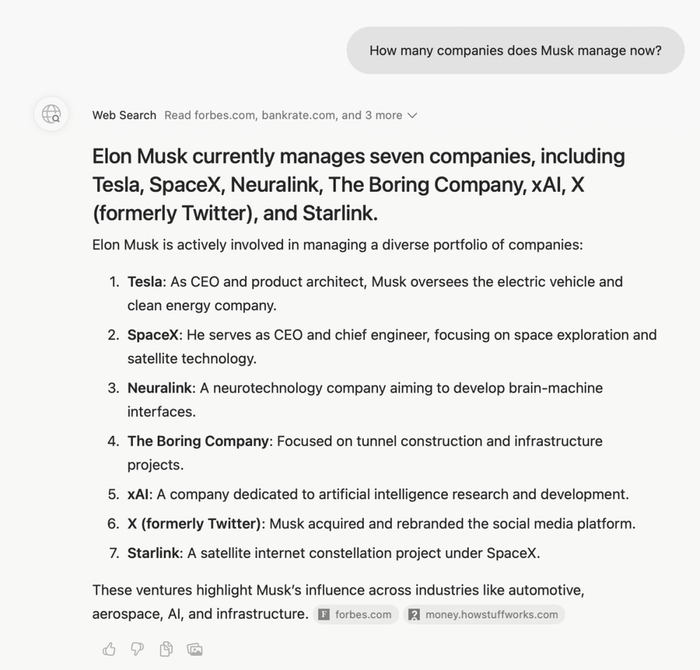 用英文提问,回答质量也不会显著提升,甚至它就把星链误认为独立公司。实测下来,Dia偶尔会在回答中附上图片;用中文提问时,有时也会意外触发英文回答。