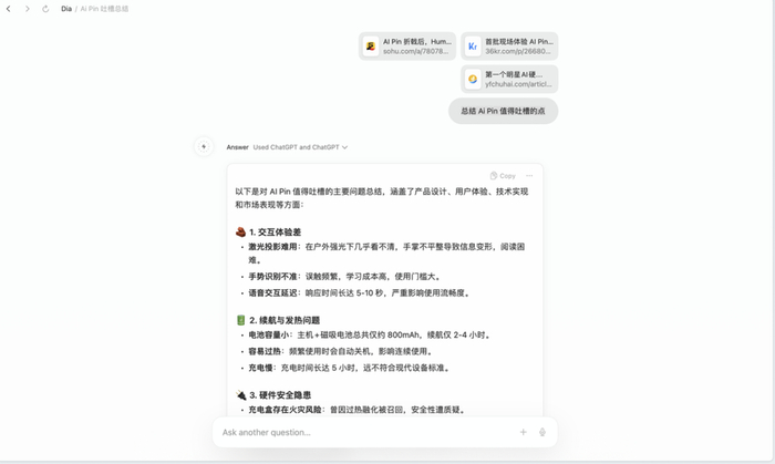 玩法很朴素,我挑选了过往几篇关于Ai Pin的文章,并让其总结Ai Pin值得吐槽的点,很快就得到了清晰的答案。