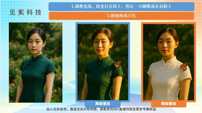 先从调色能力说起。我们手头有一张写真的照片,里面的模特也是AI生成的。这张照片的光线感有点平淡,不够生动。于是,我们对GPT-4o说:“调整光线,让阳光洒在脸上,再让一只蝴蝶落在肩膀上。”结果GPT-4o真的按照我们的要求,把光线调整成了阳光打在脸上的效果,画面一下子就有了生机。不过,它也有个让人头疼的问题——模特的面孔变了。我们用同一个主体做了两次调整,每次面孔都不一样,一致性保持得不太好。