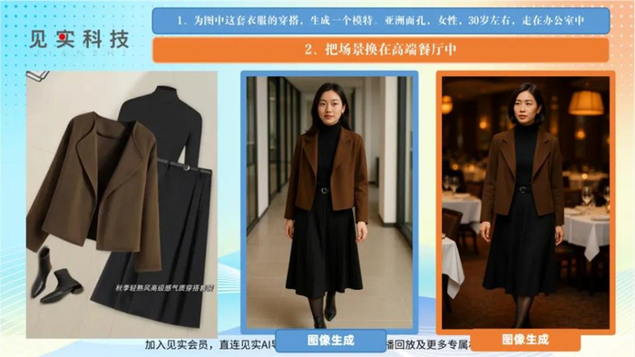 我们继续给出服装,用自然语言让GPT-4o生成一个匹配的模特,它就能直接生成。现在模特在办公室场景,我们用自然语言把场景换成餐厅,它就能替换对应的穿搭,不需要拆分图片,只要把衣服丢给GPT-4o就行。