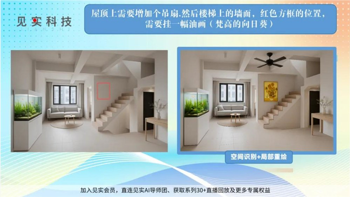 再看一个更精准的。我们有一个已经渲染好的图,想做一个精准调控。比如,“屋顶上需要增加吊扇,然后楼梯上墙面,红框位置需要挂一幅油画(梵高的向日葵)”。结果大家可以看到,GPT-4o生成的效果完全按照我们的需求来。