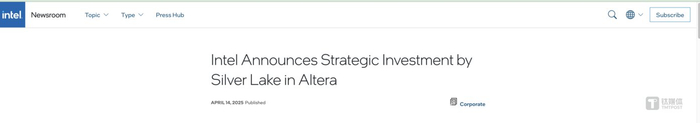 4月14日消息,钛媒体AGI获悉,英特尔公司(Intel,NASDAQ: INTC)宣布,其与银湖资本达成最终协议,将旗下Altera业务51%的股份出售给银湖资本(Silver Lake),从而成为独立的FPGA半导体公司。摩根士丹利担任英特尔的财务顾问。