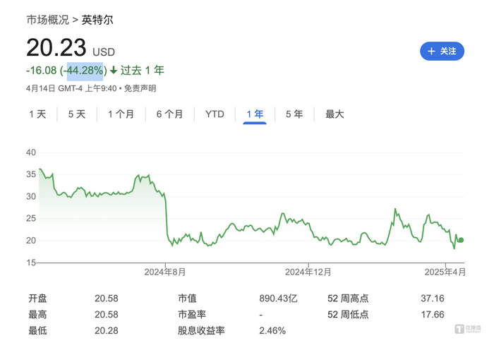 截至发稿前,英特尔股价盘初涨近4%,最新涨超2.8%,市值达890亿美元左右。过去12个月内,英特尔股价累计下跌44%左右。
