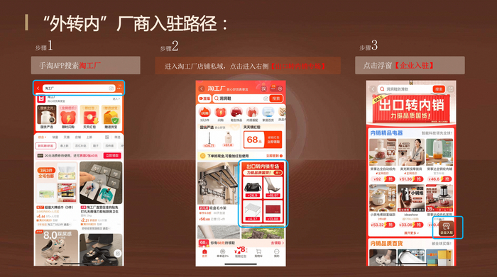 图说:淘宝 APP「外转内」厂商入驻路径:手淘 APP 搜索淘工厂,进入淘工厂私域店铺,点击进入右侧【出口转内销专场】,点击浮窗【企业入驻】。