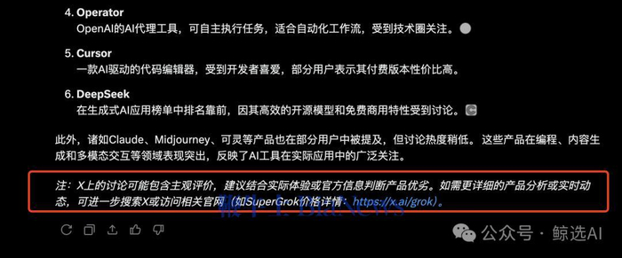 鲸哥搜海外最近火爆的AI产品,Grok也能结合推特数据给出信息,这点确实不错。