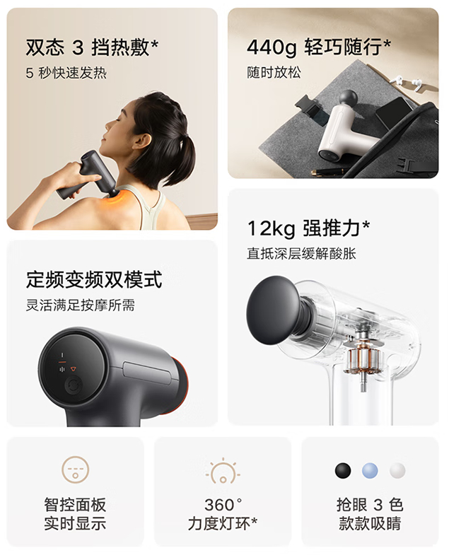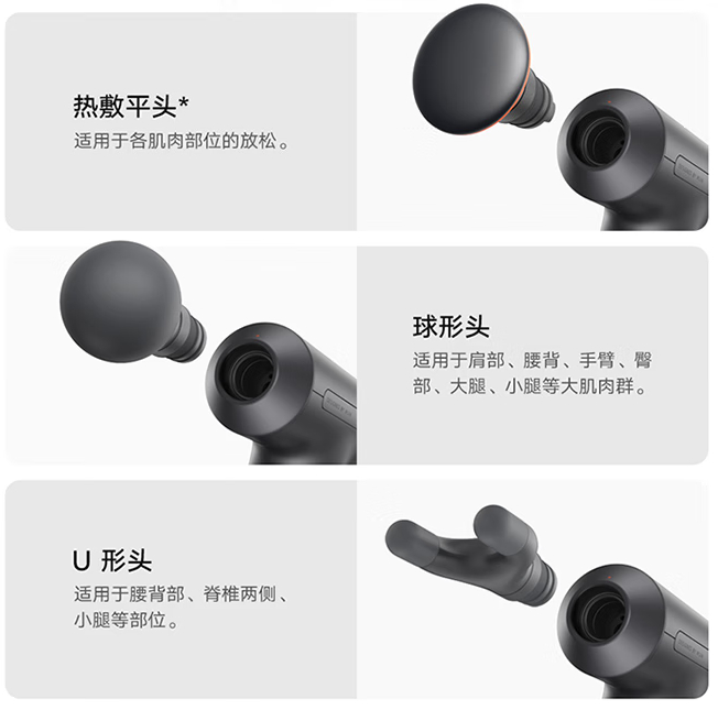 新品定制款无刷电机,12kg 强动力直达 6mm 以下深层筋膜,提供 3 款专业按摩头:热敷平头,球形头,U 形头。新品支持定频运动、变频按摩双模式,每个模式各设 3 个挡位,不同挡位模式灵活调节组合。
